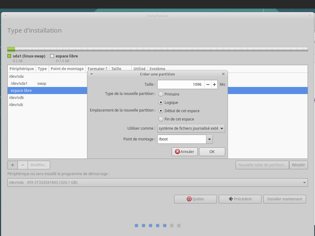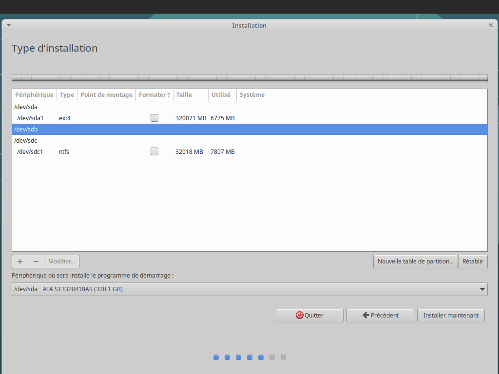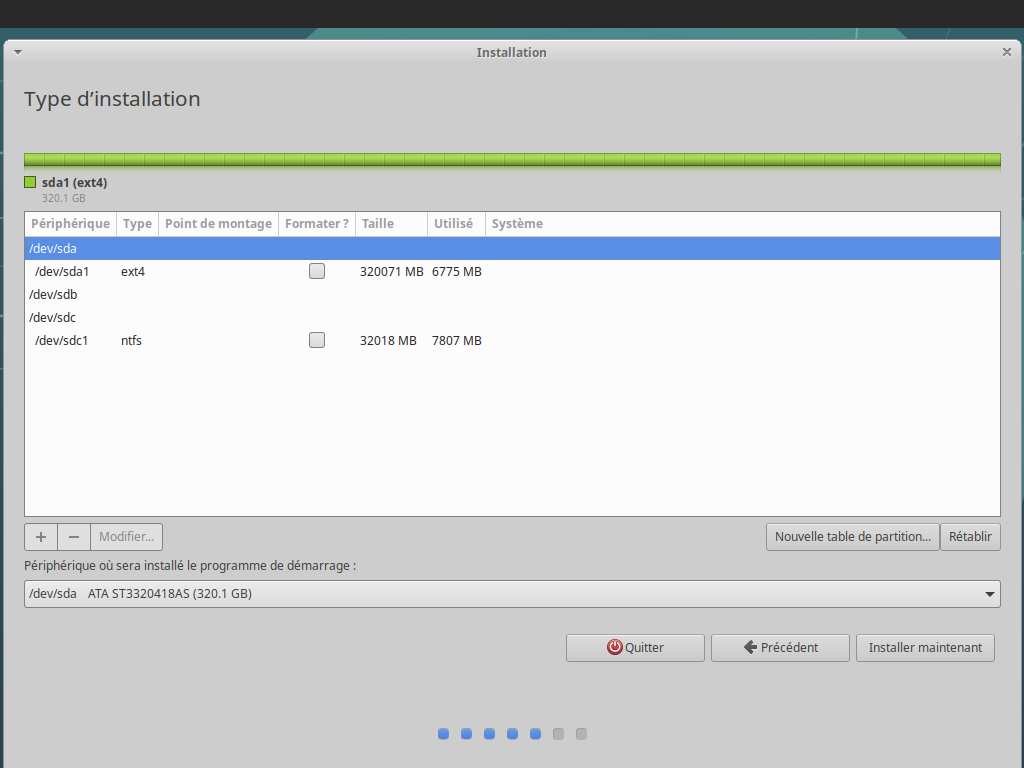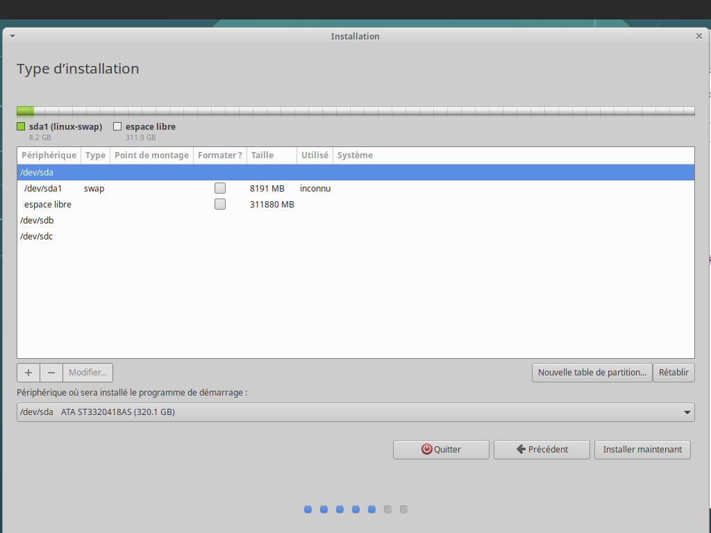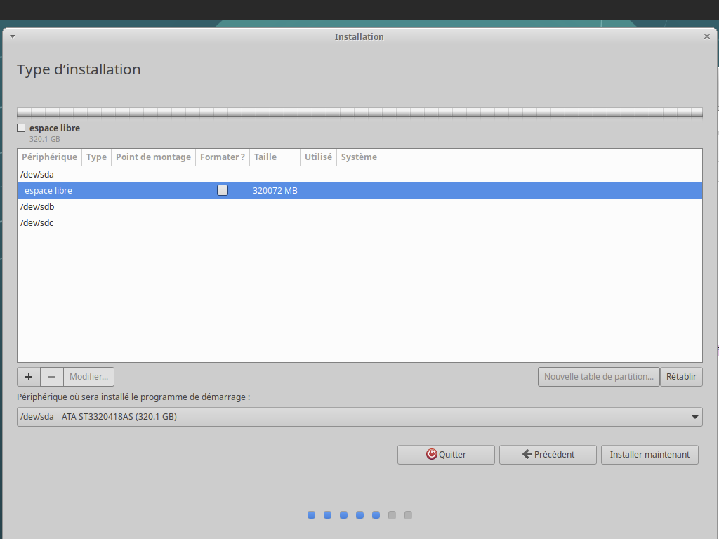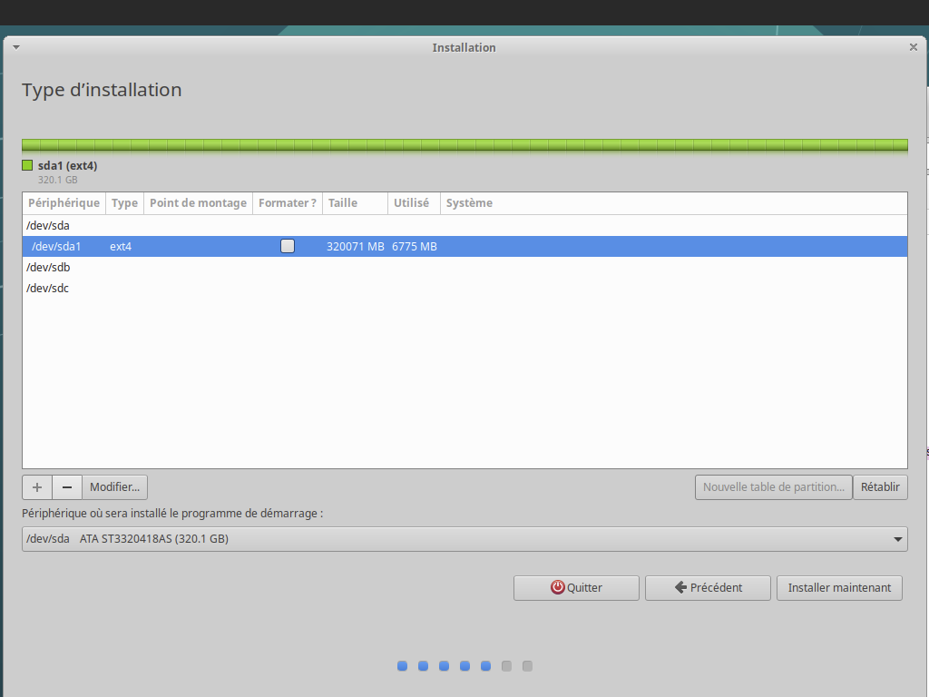 Identifier le disque dur. Il faut s'appuyer sur l'espace disque utilisé et le type de partition. Dans l'exemple, il s'agit de /dev/sda car c'est le seul dont le taille est de 320 G