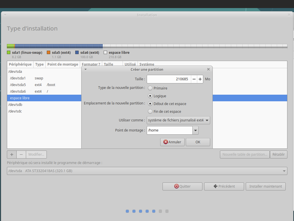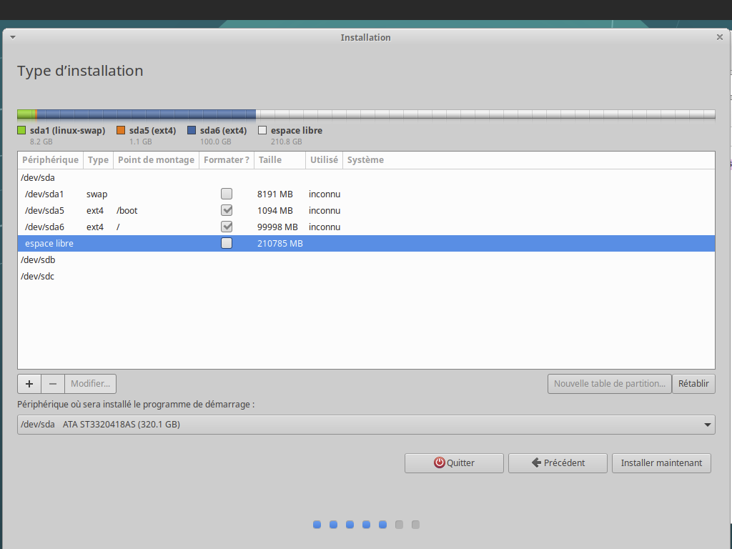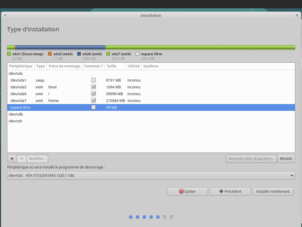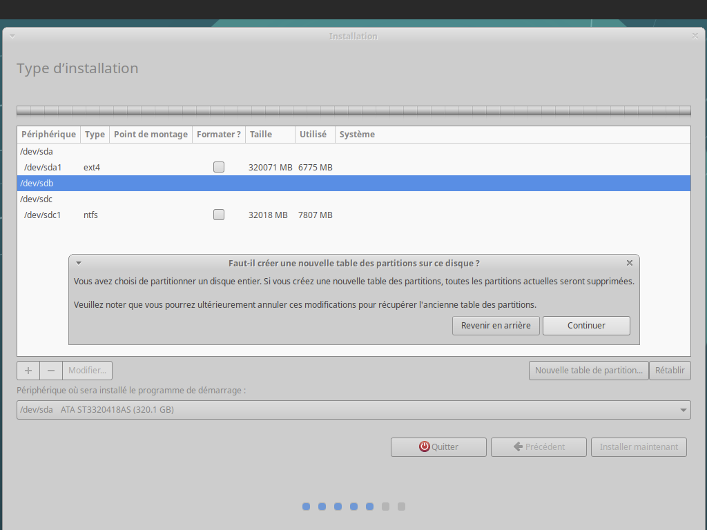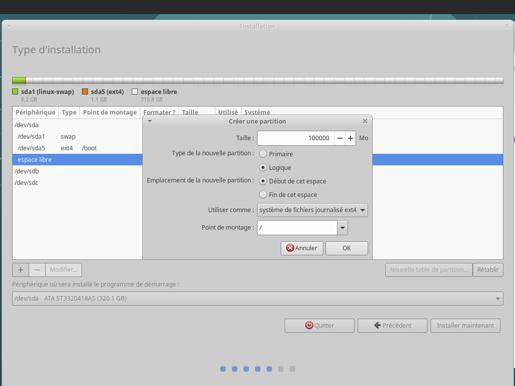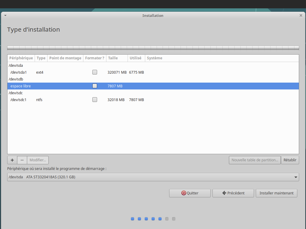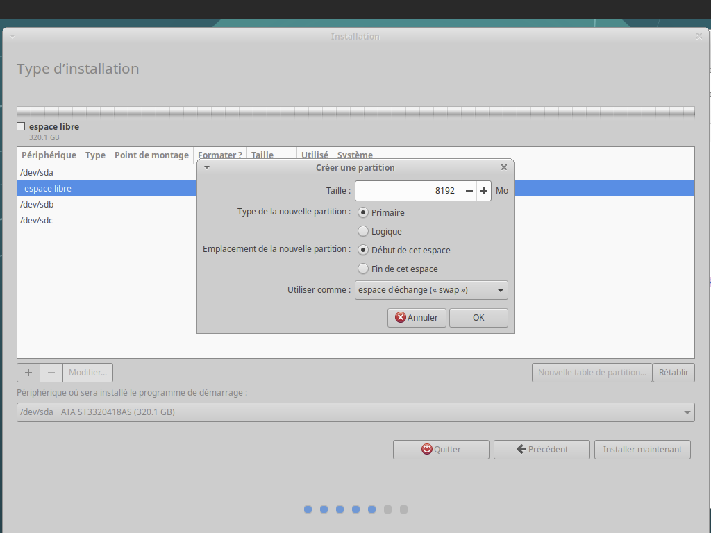 Identifier le disque dur. Il faut s'appuyer sur l'espace disque utilisé et le type de partition. Dans l'exemple, il s'agit de /dev/sda car c'est le seul dont le taille est de 320 G
