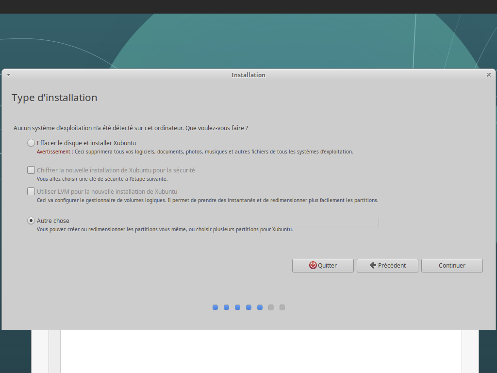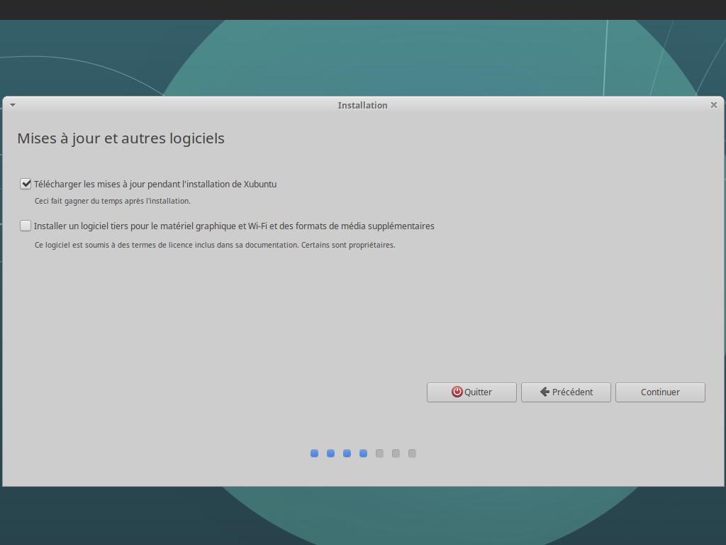 Choisir “Télécharger les mises à jour pendant l'installation de Xubuntu” et cliquer sur le bouton Continuer