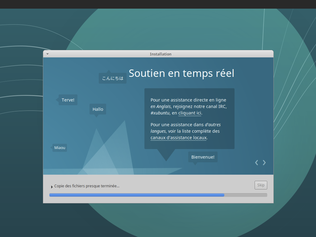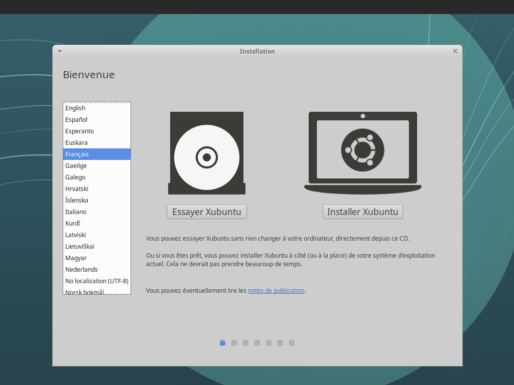 Le programme d'installation Xubuntu se lance. Vous pouvez essayer xubuntu sans rien changer à votre ordinateur directement depuis le support. Dans notre cas, nous allons installer Xubuntu tout de suite sur l'ordinateur. Choisir la langue et cliquer sur le bouton Installer Xubuntu