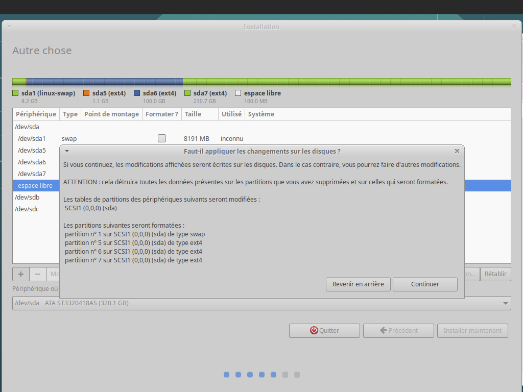 Un écran récapitulatif indique les modifications des partitions sur les disques